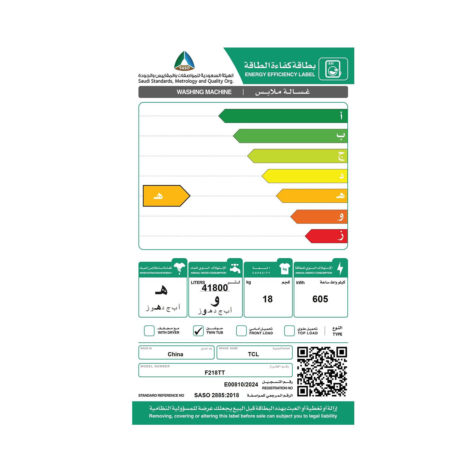 The TCL F218 TT 18 kg double basin washer offers a perfect solution for your family's laundry requirements. Featuring a sleek white color design, this washer is a great addition to any kitchen or laundry room. With its large capacity, this washing machine can handle large quantities of clothes in a single cycle, saving users time and effort. The washing machine runs on 220V electricity and features a spin speed of up to 700 RPM, ensuring efficient and fast drying of clothes. Ideal for large families or those who need to do laundry frequently, the TCL washing machine reduces the laundry load. With a two-year warranty, this washing machine embodies quality and reliability, making it a favorite choice in its class. Invest in the TCL F218 TT washing machine today and make laundry easier and more efficient in your daily life.