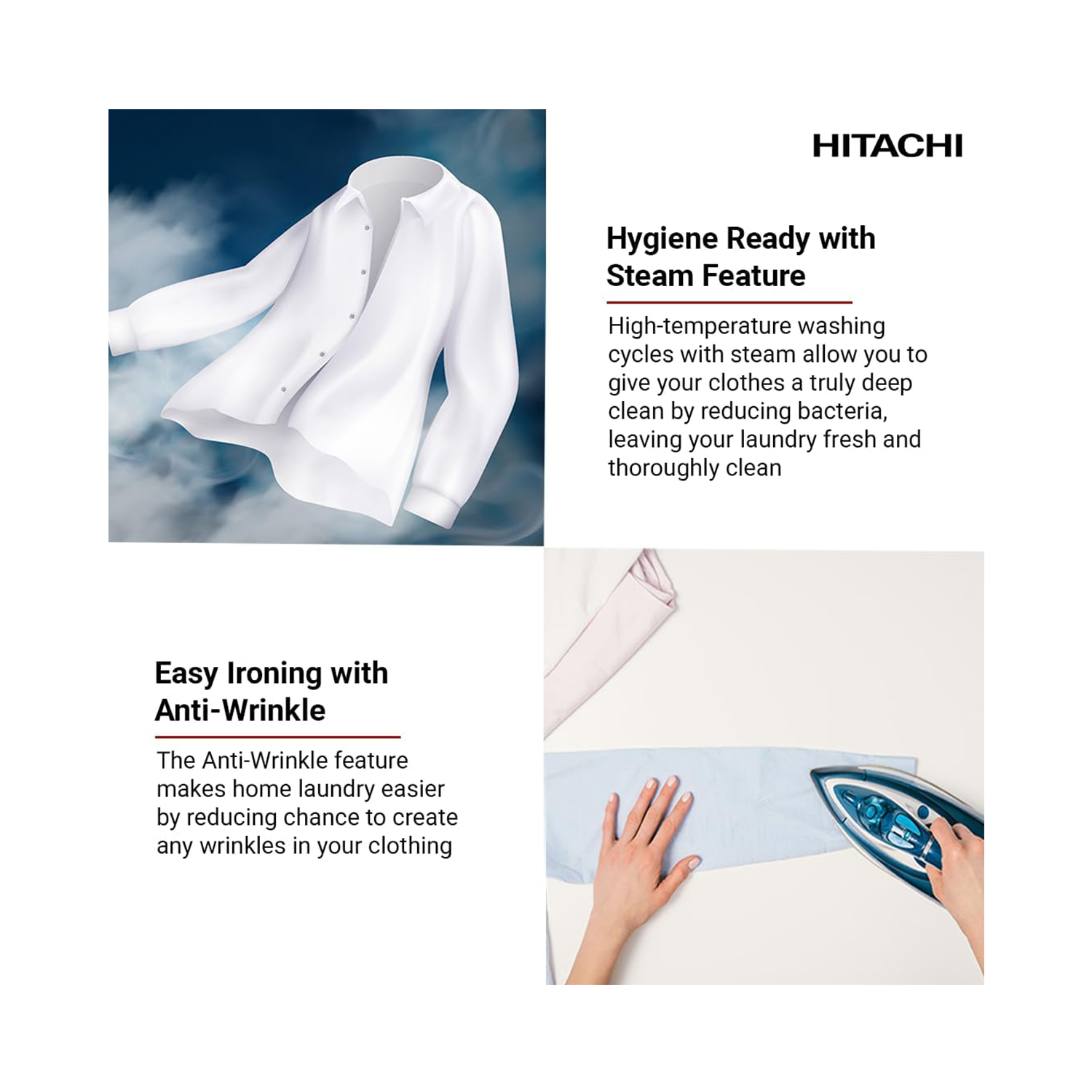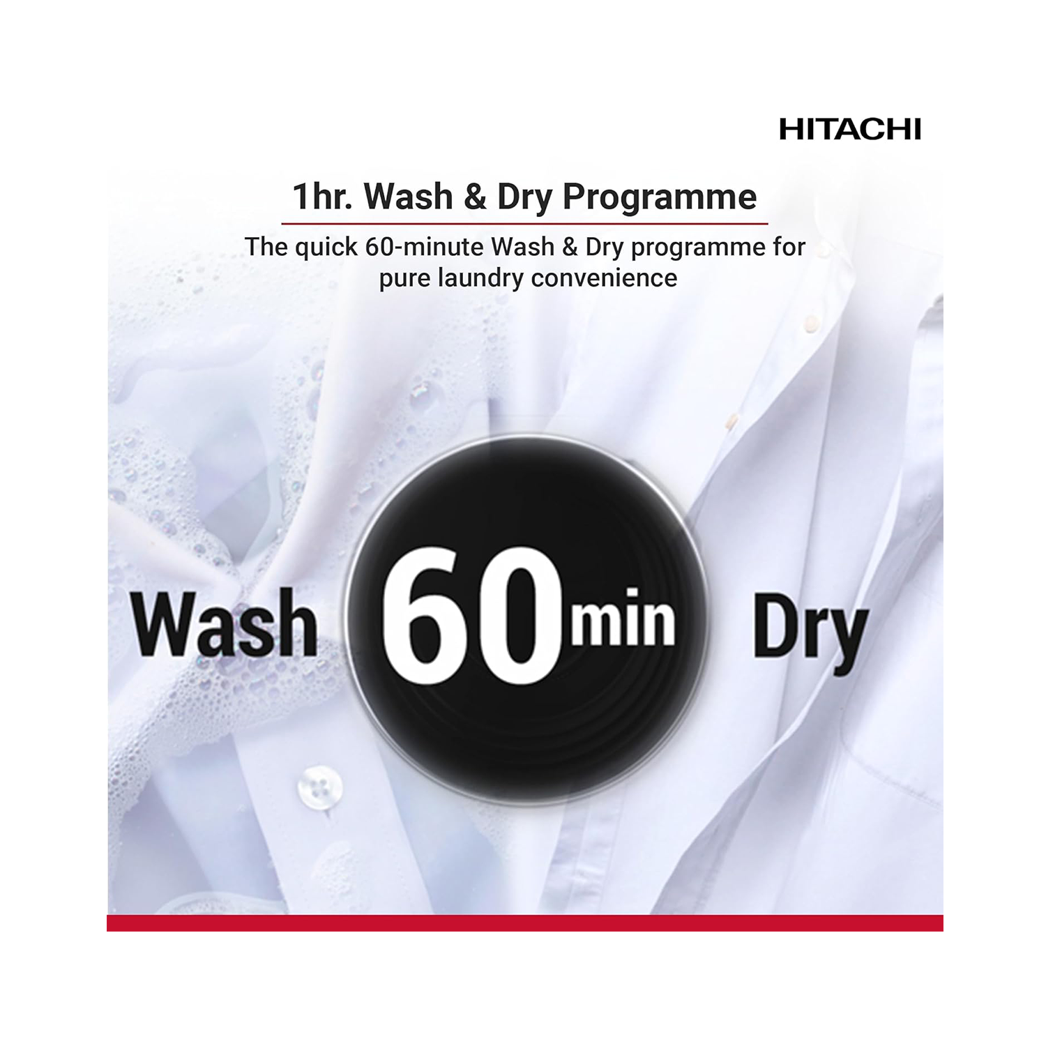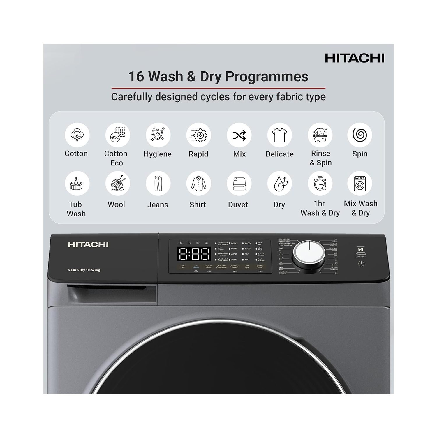 غسالة فول اوتومايك هيتاشى , تحميل امامي , 16 برنامج , 10.5 كجم غسيل ,7 كجم تجفيف, فضي