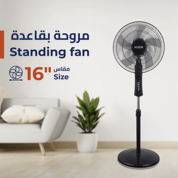 مروحة ستاند كيون , 16 بوصة , 5 شفرات بلاستيك , 3 سرعات , ريموت كنترول , اسود , 65 وات