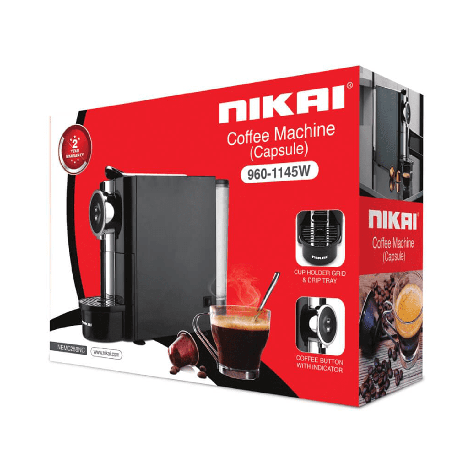 نيكاي ماكينة تحضير القهوة , كبسولات , 20 بار ضغط , 2 كوب , خزان 0.70 لتر , 960 وات