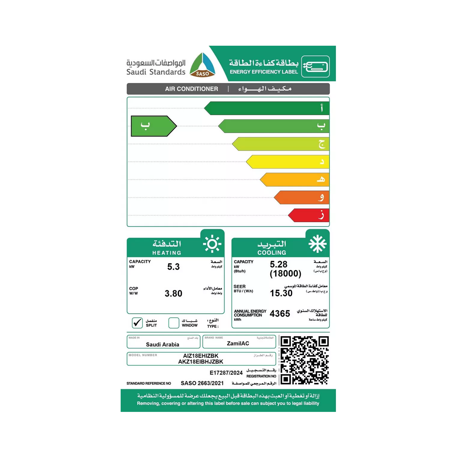 مكيف جداري سبليت الزامل, بارد , حار ,18000وحدة
